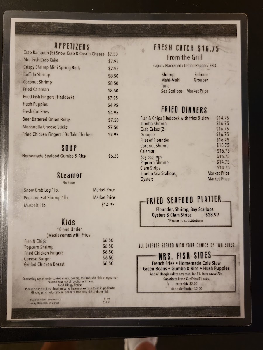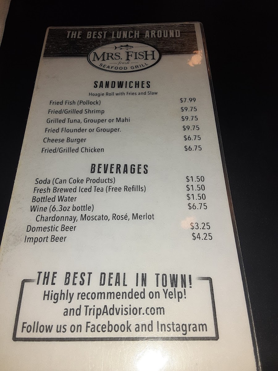 Welcome to Mrs Fish Seafood Grill, a hidden gem nestled at 919 Broadway St, Myrtle Beach, SC. This delightful eatery brings the taste of the sea straight to your plate, featuring a menu that celebrates freshness and bold flavors.